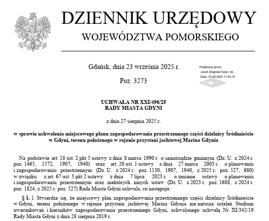 Informujemy, że w Dzienniku Urzędowym Woj. Pomorskiego pod poz. Nr 3237 został ogłoszony miejscowy plan zagospodarowania przestrzennego części dzielnicy Śródmieście – terenu położonego w rejonie przystani jachtowej Marina Gdynia. Plan wejdzie w życie po upływie czternastu dni od dnia ogłoszenia, czyli dnia 8 października. Plan dla Mariny to pierwszy plan sporządzony przez Biuro Planowania Przestrzennego Miasta Gdyni w tzw. nowym trybie, tj. z uwzględnieniem zmian wprowadzonych reformą planistyczną.