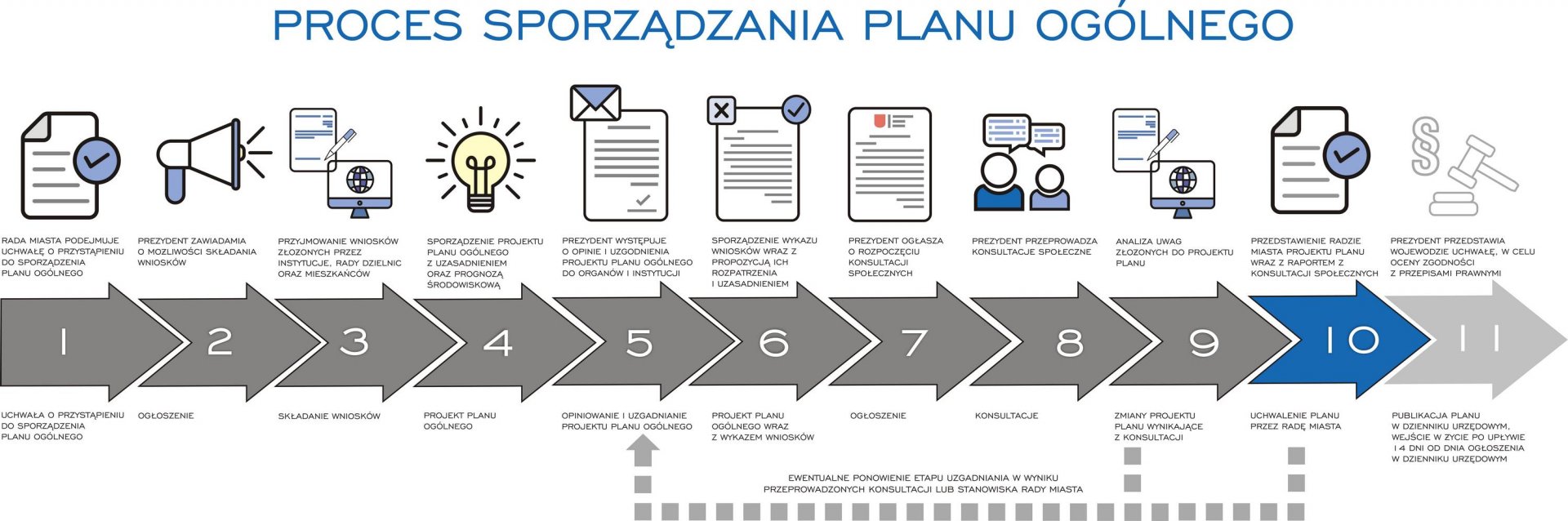 Organem odpowiedzialnym za sporządzenie projektu planu ogólnego jest Prezydent Miasta, który po przeprowadzeniu procedury planistycznej, przedstawi go do uchwalenia Radzie Miasta. Procedura sporządzania projektu planu ogólnego obejmuje m.in. obowiązek uzyskania opinii i uzgodnień właściwych organów, a także przeprowadzenie procesu konsultacji społecznych.